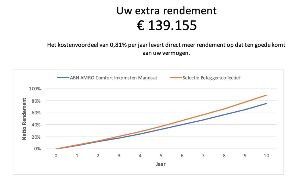 Door te kiezen voor een vermogensbeheerder uit de selectie van het Beleggerscollectief met een gemiddelde beheerfee van 0,40% i.p.v. een duurdere vermogensbeheerder (in dit voorbeeld ABN AMRO Comfort Inkomsten Mandaat beheer fee 1,21%) is de jaarlijkse besparing op de beheerfee gemiddels 0,81%. Uw extra rendement EUR 139.155,=